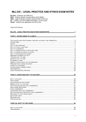 T2 2018 Deakin notes including case summaries and legislative snippets. Notes are a mixture of textbook information, topic summaries and lecture material. Topics covered: Topic 1 & 2: not covered Topic 3: Duties owed to clients Topic 4: costs and duty to account Topic 5A: Duty to the court Topic 5B: Duty owed to the administration of justice Topic 6: duties owed to the profession Topic 7: Complaints and discipline