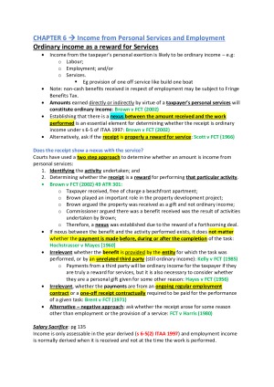 A comprehensive set of notes covering the entire course. Topics include: 1. Introduction to Tax 2. Sources of Taxation Law 3. Study Skills 4. The Tax Formula 5. Income Concepts 6. Income from Personal Services 7. Taxation of Fringe Benefits 8. Income from Business 9. Income from Property 10. Residence and Source 11. Capital Gains Tax 12. General Deductions 13. Specific Deductions 14. Capital Allowances 15. Tax Accounting and Trading Stock 16. Partnerships 17. Trusts 18. Taxation of Companies and Shareholders 19. Tax Avoidance 20. Tax Administration 21. GST