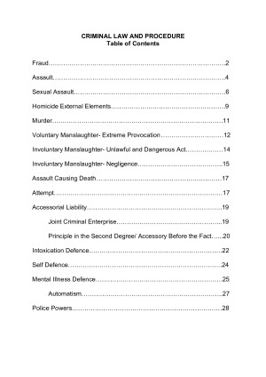 These notes are made up of the relevant tutorial slides and textbook readings for the exam and problem solving assignment. They succinctly go through the possible problem issues and detail the steps to solve them through with the relevant case law and statute which are colour coded. They also give possible intro and conclusions for the different issues. The topics covered in these notes are: - Fraud - Assault - Sexual Assault - the Homicide External Elements - Murder - Voluntary Manslaughter - Involuntary Manslaughter - Assault Causing Death - Attempt - Accessorial Liability- JCE and Principle in the Second Degree - Intoxication Defence - Self Defence - Mental Illness and Automatism - Police Powers