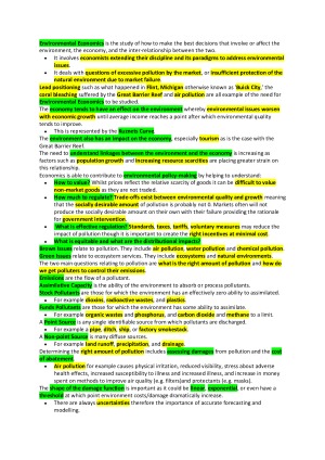 Full course notes including every weeks topics, perfect to use in preparation for the exam! Topics included are Introduction to Environmental Economics, Market failure, Demand for Environmental Goods and Bads, Regulation and Cost-Benefit Analysis, Valuing Environmental Resources, Optimal Regulation & Property Rights, Tradable Permits, Climate Change, Renewable Energy, and Trade & Development.