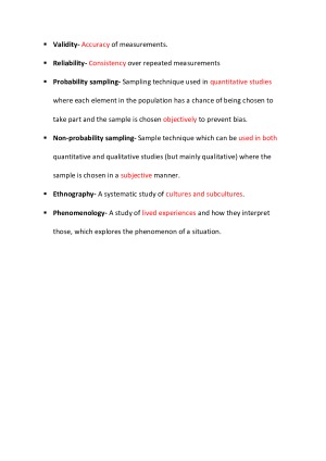 Includes all the definitions found in each weekly content. Definitions are on the following topics: • Types of research • Study designs • Sampling techniques • Ethics in research • Types of data • Data collection methods • Data analysis types • Clinical audit Taken from my own notes, cloud site and text book. The important terms in definitions have been highlighted.