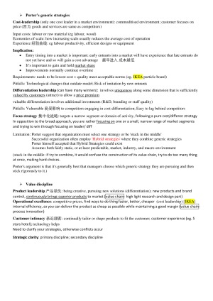 Strongly recommend these notes which include EVERY key knowledge in Buss6000. They are also well structured. Extremely helpful to prepare for the FINAL exams (You can take these notes into exam. Take it and you will not need other learning materials ^^) * the notes contain the key contents in lecture notes; contain a little bit Chinese (the Chinese content is not important, just for easy understanding) * List of topics covered: 1 External Environment- 6 Megatrends; Evolving business models; PESTLE; Porter’s five forces; Ansoff Matrix 2 Internal Analysis- Value chain; VRIO 3 Strategy- Porter’s generic strategies; Value discipline ; SWOT; growth& stable & renewable strategies; Growth Horizons Model etc. 4 Organising for strategic success- structure, systems, culture 5 Business ethics 6 Entrepreneurship 7 Leadership 8 Team 9 Others: Case Studies; Exam Tips