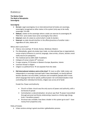 Topics and Theories include: - Westphalia - International Relations History - Liberalism - Realism/Neorealism - Marxism -Positvism/ Postpositivism - Gender perspectives in IR - Constructivism - Post-structuralism - Post-colonialism Extra brief tips are also included in the notes