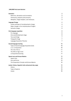 The notes cover the main points from the weeks that were assessable on the final exam in Sem 1, 2018 - this could change depending on where the midsem falls in Sem 1, 2019 or other changes to the assessment in the course. Topics: Semantics Language change First language acquisition Second language acquisition Speech acts Gricean maxims Auslan