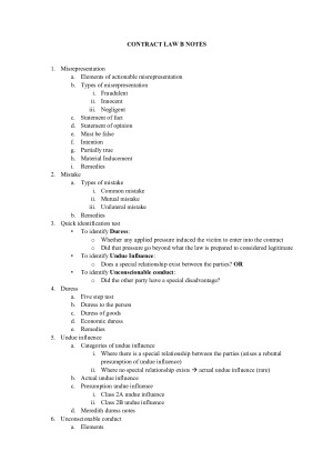 Comprehensive and easy to follow contract law B notes. Essentially your bible to the end of semester exam! Sets out a guide to answering problem questions. 1. Misrepresentation 2. Mistake 3. Quick identification test 4. Duress 5. Undue influence 6. Unconscionable conduct 7. Statutory unconscionability pursuant to the Australian consumer law 8. Privity 9. Construction of exclusion clauses 10. Misleading and Deceptive Conduct 11. Statutory Unconscionability 12. Unfair Contract Terms 13. Consumer Guarantees For a more detailed description check out the table of contents page in the sample given! Save yourself the time and hassle during the semester of compiling the textbook and lecture slides, just buy these notes and understand the topic before before class and before everyone else. Use these notes on mock exams and practice questions or even you semester assignments!