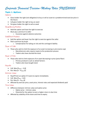 Detailed but concise set of notes that can help you achieve your H1! Topics: - Options - Equity - Debt and Leasing - Weighted Average Cost of Capital/ Capital Structure - Payout Policy - Sensitivity, Break-Even and Decision Tree Analysis - Real Options Analysis - Analysis of Takeovers - Corporate Restructuring - Risk Management 99 was the highest mark in the cohort. Included in the notes are additional readings, tutes and lectures in case you missed anything! Just in case you are wondering, this is the actual CFDM. Most of the other notes are for Corporate Finance, a similar but different subject. GL with that elusive H1!