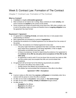 These notes are very detailed and easy to understand. It is a mix of lecture notes as well as components from the textbook. It had help me through the mid-semester test as well as the finals. Diagrams from the textbook are provided to explain certain theories. These notes got me a Distinction for this unit The topics are: 1. Business and the Law 2. Australian Legal System 3. Deliberately Causing Harm 4. Carelessly Causing Harm 5. Contract Law: Formation of Contract 6. Contract Law: Terms of the Contract 7. Contract Law: Capacity, Legality, Consent 8. Contract Law: Remedies and Ending a Contract 9. Dealing with Consumers: General Protections 10. Dealing with Consumers: Specific Protections 11. Managing a Business: Start-up