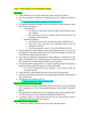 MLL405 - Equity and Trusts notes incorporating information from textbooks, lectures and lecture slides and detailed case notes. Colour coded: Yellow: new topic Green: new topic subsection Blue: cases Pink: legislation Case notes give brief description of facts, the issue and judgment. All sorted in alphabetical order. Blank pages to ensure when printing to bind each new topic starts on a new page. I would bind with small dividers separating each topic and large dividers separating topic notes, case notes and any relevant legislation.