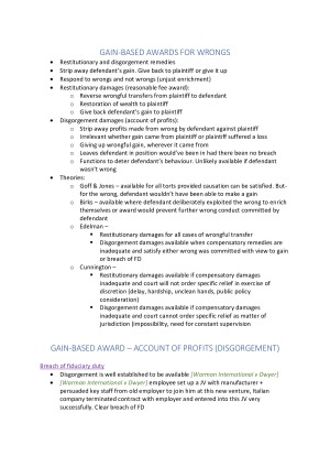 These notes summarises all examinable lectures slides and relevant textbook chapters. The notes are set out logically such that you are able to tackle a problem question with ease, clearly outlining the steps required and the case authorities for the propositions (all colour coded!) They are designed so that it is easy to follow under time pressure in an exam setting. Topics include: - Gain-based awards for wrongs - Account of profits (disgorgement) - Reasonable fee award (restitutionary) - Unjust enrichment - Rescission - Specific performance - Injunction - Exemplary damages - Aggravated damages - Proprietary remedies - Apologies and declaratory relief - Self-help remedies