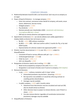 These notes summarises all examinable lectures slides and relevant textbook chapters. The notes are set out logically such that you are able to tackle a problem question with ease, clearly outlining the steps required and the case authorities for the propositions (all colour coded!) They are designed so that it is easy to follow under time pressure in an exam setting. Topics include: - Company organs - Company constitution - Directors' duties - Duty of care, skill and diligence - Loyalty, good faith and for a proper purpose - Conflict of interests - Improper use of position or information - Related party transaction - Accessorial liability - Ratification & authorisation - Relief from liability by court - Consequences of breaching a duty - Corporate contracting - Indoor management rule - Statutory assumptions - Members' remedies (oppression remedy) - Winding up - Statutory injunction - Statutory derivative action - Equitable constrains on alteration to constitution