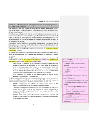 This note arranges cases alphabetically, has pinpoint citation to page or paragraph number (as in law report), and sets out key points emphasised in class discussion by yellow highlights, track changes and comments. The notes cover the 12 weeks' cases including the following topics: - Compensatory damages for common law breach of contract - Compensatory damages for common law tort - Compensatory damages for misleading and deceptive conduct under ACL - Equitable compensation - Normative and exemplary damages - Specific performance - Injunction - LCA damages in lieu of specific relief - Account of profits - Restitutionary damages for common law wrongs - Restitution for unjust enrichment - Rescission - Nominal damages - Self-help remedies - Constructive trust Each case begins with notes on court level, year, judges and topic covered, followed by facts and pinpoint decision references, and sometimes ends with extract from casebook summary on relevant law. I also sell my exam notes for Remedies on StudentVIP.