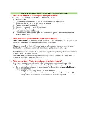 GEN3030 has a lot of content packed into each lecture and this can be quite overwhelming. Given that there is not much practice provided leading up to tests / exams in this unit, I created this document of practice questions. These self formulated questions and answers are very useful in ensuring that you understand the finer details of each concept. Organised very clearly with questions followed by detailed answers, this document will help you will ace the exam! These questions / answers include topics from weeks 2 - 12. Completing these questions and having the answers available will allow you to practice as much as you like and provide yourself with more confidence going into the exam. Week 1 was more of an overview of the unit, content and structure with less of a focus on new content. You will therefore find this document starts at "week 2". Please note these notes are from GEN3030 Semester 2, 2018 at Monash University Clayton. There may be slight variations in the current course content, but a lot of the content remains the same. For example, topics covered now may have been covered in different weeks of the semester back in 2018. Please check the topics covered below. This document includes practice material for short answer and extended response sections of the final exam. These questions can also be used to prepare for the mid semester test / quizes and prac reports. Each question is also accompanied by a reference of which week / topics the question relates to! In this way, you will be able to identify problem areas and subsequently search in your lecture notes / textbook. Topics Covered: - Weeks 1-3: Gene Regulation In Eukaryotes - Week 4: Genetic Control Of The Drosophila Body Plan - Week 6: Apoptosis - Week 7: Neurogenetics & Behavior - Week 8: Gene X Environment Interactions & Plant Development - Week 9: Pant Development - How Plant Development Differs From That Of Animals - Week 10: Plant Meristems - How Do Plant Tissues And Organs Arise? - Week 11: Evo-Devo In Animals – How Are Developmental Processes Modified To Generate Diversity? - Week 12: Genetic Control Of Circadian Rhythms