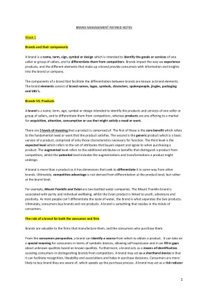 These notes are a comprehensive, wholesome set of notes that incorporate both the online lecture content from Weeks 1-12 as well as the textbook content. They are refined, and therefore extremely compact and concise, but thorough. The notes are separated by weeks and further separated by clearly defined sub-topics that will guide your study, and DIRECTLY translate to the learning outcomes of the unit which represent how the questions on the exam are likely to be asked! These notes are extremely useful and need not be supplemented with other notes. They are the complete, full package! Please note - what is taught in workshops and online lessons only skims the surface of the required breadth and depth of content you need to succeed. That's why I've supplemented them HEAVILY with the paraphrased unit textbook to account for this (I've saved you hours!) Topics Covered: - Intro to Brand Management - Consumer Based Brand Equity and Resonance - Brand Positioning - Brand Elements - IMC and Leveraging Secondary Associations - Measuring Brand Equity - Brand Extensions and Branding New Products - Reinforcing, Revitalising and Retiring Brands - International Brand Management - Conducting a Brand Audit (Same as Measuring Brand Equity) - Branding Trends