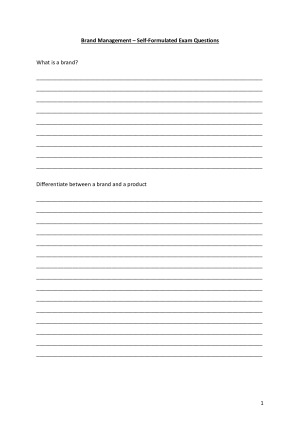 These are some fantastic self formulated questions to help you test your knowledge. They were formulated under the guidance of the learning outcomes and are thus, thorough. Try and group some of these together to come up with larger essay questions as you see fit. The topics are interconnected when they're examined! All topics from Week 1-12 are incorporated in this file. I've formatted the file as a worksheet to make your life easier too! A great supplementary tool for some extra practise as the practice examples provided by the faculty are minimal. *For comprehensive exam notes see BRAND MANAGEMENT REFINED EXAM NOTES FROM AN HD STUDENT - 88% Topics Covered Through QNS: - Intro to Brand Management - Consumer Based Brand Equity and Resonance - Brand Positioning - Brand Elements - IMC and Leveraging Secondary Associations - Measuring Brand Equity - Brand Extensions and Branding New Products - Reinforcing, Revitalising and Retiring Brands - International Brand Management - Conducting a Brand Audit (Same as Measuring Brand Equity) - Branding Trends