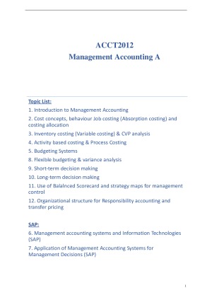 Topic List: 1. Introduction to Management Accounting 2. Cost concepts, behaviour Job costing (Absorption costing) and costing allocation 3. Inventory costing (Variable costing) & CVP analysis 4. Activity based costing & Process Costing 5. Budgeting Systems 8. Flexible budgeting & variance analysis 9. Short‐term decision making 10. Long‐term decision making 11. Use of Balalnced Scorecard and strategy maps for management control 12. Organizational structure for Responsibility accounting and transfer pricing SAP: 6. Management accounting systems and Information Technologies (SAP) 7. Application of Management Accounting Systems for Management Decisions (SAP)