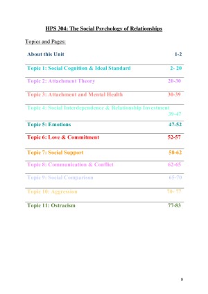 Lecture, Tutorial and readings notes. Topic 1: Social Cognition & Ideal Standard 2- 20 Topic 2: Attachment Theory 20-30 Topic 3: Attachment and Mental Health 30-39 Topic 4: Social Interdependence & Relationship Investment 39-47 Topic 5: Emotions 47-52 Topic 6: Love & Commitment 52-57 Topic 7: Social Support 58-62 Topic 8: Communication & Conflict 62-65 Topic 9: Social Comparison 65-70 Topic 10: Aggression 70- 77 Topic 11: Ostracism 77- 83