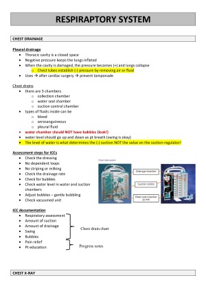 These are the notes I made throughout the semester for NUR5002. This document contains information from week 0-14. I have included medical-surgical nursing information, disease conditions and pharmacology for all the body systems. All the information is under each topic. This document is clean, neat, contains tons of information, images, and diagrams! --- Topic List --- WEEK 0 - COMPULSORY CLINICAL SKILLS FLUIDS AND ELECTROLYTES PHARMACOLOGY BASICS RESPIRATORY SYSTEM CARDIOVASCULAR SYSTEM RENAL SYSTEM SHOCK AND TRAUMA MUSCULOSKELETAL SYSTEM HEMATOLOGY, VASCULAR AND PAIN NEUROLOGICAL SYSTEM ENDOCRINE SYSTEM GASTROINTESTINAL SYSTEM NOTE - even though this is a very large document, this obviously does not contain all the information provided in the textbooks, ebooks, and lectures. I have attempted to include as much as I can. Make sure you work through the ebooks each week and add your own information if needed. Also, the pharmacology tables under each system contain a compacted list of medications. Pls, do your own research if you want more information. Remember that I have made these notes with what I thought was important! Your's might be different. IMPORTANT - Unauthorised replication, free distribution, and unauthorized selling of document are prohibited and simply unethical. This is someone else's hard work so don't misuse it.