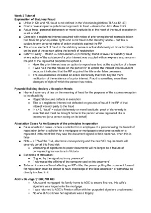 Includes all 12 Lecture and tutorial notes with bolded headings, section numbers and limitations. Majority of cases have notes about what the case was or what the outcome/rule from the case is. Covers topics such as: - Fraud - Paramount Interests - Constructive/Express/Implied Trusts - Equity and Property - Cavets & How to Remove Them - Electronic Conveyancing - Leases - Covenants & Restrictive Covenants