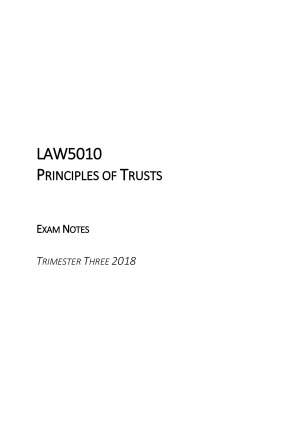 Exam notes created in Trimester 3 2018 for LAW5010 Principles of Trusts (Monash JD). These notes are designed to act as a clear and concise checklist. They clearly go through each step that must be considered in an exam, and are filled with clear authorities. These notes have been colour coded for ease of use. These Notes Include: -Introduction to Trusts -Creation of Trusts -Certainty of Intention -Certainty of Object -Certainty of Subject Matter -Constitution of Trusts -Formalities -Failed Creation -Charitable Trusts -Quistclose Trusts -Trustee's Powers -Trustee's Duties -Trustee's Rights -Beneficiary's Rights -Remedies for Breach Note: For the best preview of the notes, view the 'preview' on a non-mobile device. Disclaimer: The accuracy of these notes is not guaranteed