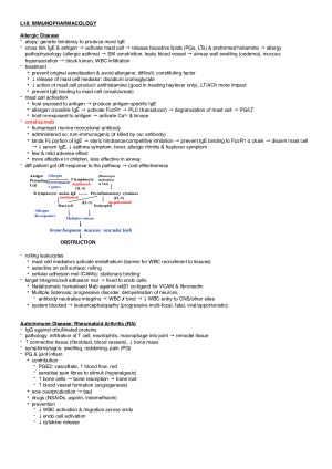 This set of notes (Part 2) comprises Lectures 18-31 while notes for Lectures 1-17 are available in Part 1 due to size constraints on this site. Each lecture note is 2-4 pages long yet contains all essential information from the lecture slides + detailed explanation stressed by lecturers. Relevant diagrams were also included. These notes were consistently edited to be clear & concise for the MST and final exam. I solely revised these notes during swotvac and managed to get H1 (90%) for this subject ☺️ Topic List: L18: Immunopharmacology L19: Drugs in Cardiovascular System - Heart L20: Drugs in Cardiovascular System - Blood Vessels L21: Drugs to Treat Diabetes L22: CNS Smart Drugs (Nootropics) L23: Drugs Used to Treat Depression L24: Parkinson’s / Alzheimer’s Disease L25: Drugs for Treatment of Obesity L26: Drugs of Dependence L27: Drugs for Pain L28: Venom & Toxins L29: Toxicology L30: Selective Toxicity I L31: Selective Toxicity II