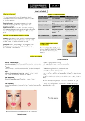 All 11 weeks of content (omitting 1 week of subject review & 1 week for mid-semester exam) - I've found lecture notes have been very sparing in terms of detail so have merged the extensive textbook notes with the corresponding lectures. 1. Introduction to Consumer Behaviour 2. Decision Process I: Situation & Problem 3. Decision Process II: Search, Evaluate & Select 4. Decision Process III: Purchase & Post Purchase 5. Internal Influences I: Perception 6. Internal Influences II: Learning & Memory 7. Internal Influences III: Motivation & Personality 8. Internal Influences IV: Attitudes & Attitude Change 9. External Influences I: Demographics & Households 10. External Influences II: Groups & Communication 11. External Influences. Trust me, this will save you SO much time as it has only the essential theories and examples needed for the Summaries at end of each section of each chapter.