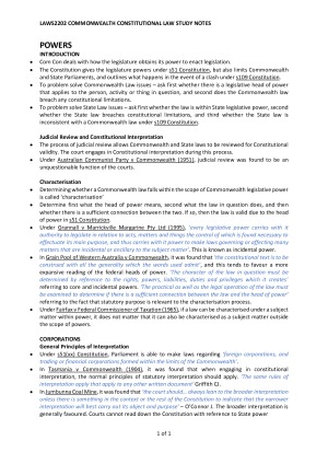 All lecture notes and reading notes from weeks 1-12 of the course. TOPIC LIST Introduction to Powers Corporations Power External Affairs Power Race Power Inconsistency Taxation Appropriations and Spending Nationhood and Executive Power Rights and Limits Intergovernmental Immunities Principle in the Communist Party Case Implications from Representative Government Implied Freedom of Political Communication Freedom of Interstate Trade Express Rights Right to Trial By Jury Right to Freedom of Religion Right to Property