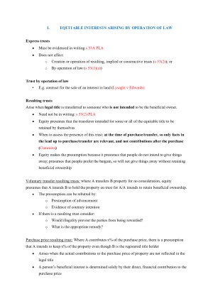 I received a HD for the subject. These notes have comprehensive case studies and the work-through steps to answering problem questions. List of topics covered: Topic 1: Equitable Interests Arising by Operation of Law Topic 2: An Introduction to the Enforceability of Property Interests Topic 3: The Principle of Indefeasibility Topic 4: Exceptions to Indefeasibility Topic 5: Unregistered Interests Under the Torrens System Topic 6: Co-Ownership (Concurrent Ownership)