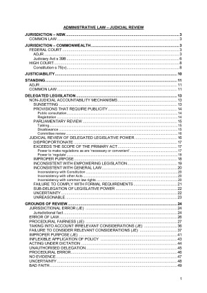 Complete summary covering the judicial review topic of Administrative Law, including ALL relevant authorities for assignments and final exam. This summary also includes HD answers to all possible short essay questions in the final exam. This summary incorporates notes from the required readings, additional readings, lecture slides and tutorials. Administrative Law is a content-dense subject so a perfect, concise set of notes is exactly what you need to ace the subject! - Jurisdiction - Justiciability - Standing - Delegated legislation - Grounds of judicial review - Jurisdictional error - Privative clauses - Remedies - Short essay questions