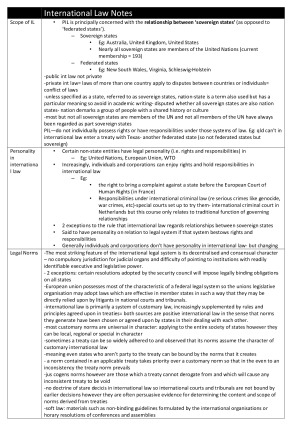 Topics: Sources of International Law, Formation of Treaties, Interpretation and Enforceability of Treaties, International and National Law, Statehood and Personality, State Responsibility, Treatment of Foreign Nationals, State Jurisdiction and Immunity, International Dispute Settlement, International Use of Force, International Criminal Law Contains all lectures and notes from Hall readings