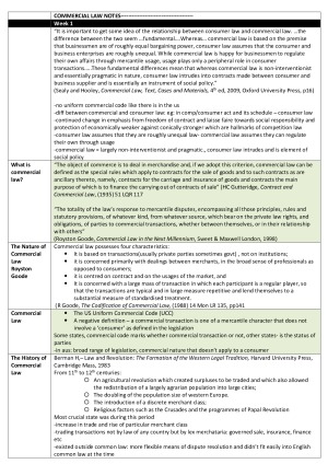 Covers lectures for all topics as well as notes on the Traves readings and notes on lectures Topics: Intro to commercial law, commercial law in theory and practice, bailment and agency, intro to sale of goods, transfer of property and title in goods, express and implied terms, the international perspective, security over personal property, introduction to banking, guarantees and bills of exchange, insurance and bankruptcy