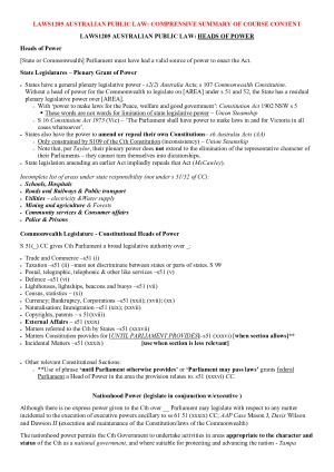 Structured notes containing both lecture and (necessary and selective) reading content. Topics have appropriate headings and subheadings corresponding to how the course was structured by the lecturers in S1 2018. Quotes and cases are referred to frequently. Students who wrote these notes finished the course with D-HD averages. NOTE: Most of the cases themselves are not summarized, nor the facts covered, in these notes - only the relevant law from them. Please refer to my separate note document for sale (Case Summary Notes) if you need that information as well. Notes are separated into the topics: 1. Heads of Power 2. The Legislature (Constitutional Structure and Election, States' Legislative Power, Manner and Form Provisions, Abdication and Delegation, Parliamentary Privilege, etc.) 3. The Executive (Structure and Power, Terminology, Accountability, Statutory vs Prerogative Power vs Nationhood Power, Conflicts, Spending, etc.) 4. The Judiciary (Definition of Judicial Power, Separation, Boilermakers, Persona Designata, Judicial Adjustment, State Judiciary, etc.)