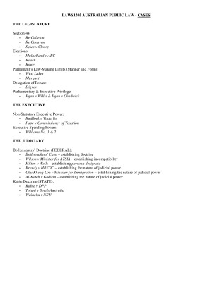 These summary notes cover all relevant cases for the S1 2018 exam. See the first page of the sample document to see a contents list. Students involved in compiling these notes achieved all D-HD marks in the course. NOTE: These notes only summarize cases from the course. See my Comprehensive Course Summary Notes for a full guide to the assessed law.