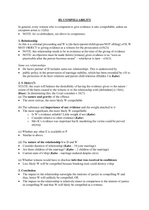 Exam notes for LAW5012 Principles of Evidence made in Trimester 3 2018 (Monash JD). These notes contain checklists, template answers and introductory sentences. They are designed clearly and concisely. Topics: -Relevance -Competence and Compellability -Privilege -Examination of witnesses -Character and Credibility -Accused's right to silence -Tendency/Coincidence evidence -Hearsay -Admissions -Illegally Obtained Evidence -Opinion Evidence Disclaimer: The accuracy of these notes is not guaranteed