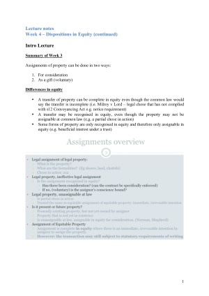The best $49 you'll spend. This is a complex and lengthy subject. My notes are detailed and well organised and allowed me to narrowly miss getting a Distinction in this subject. 174 pages of notes covering the entire topic of Equities and Trusts from MQU Law School. Topics covered: - Introduction; History & Nature of Equity - The relationship between common law and equity; The nature of equitable interests - Dispositions in Equity - Fiduciary Obligations & Introduction to Trusts - Express Trusts - Trustees - Beneficiaries - Charitable Trusts - Resulting Trusts - Constructive Trusts - Equitable Estoppel Notes are organised with clear headings and all cases/legislation titles highlighted in yellow which makes it really quick to find relevant information during assessment tasks.