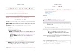 Exam notes created for LAW5011 T3 2018 These notes include a brief outline and checklist of every topic as well as relevant case summaries. TOPICS INCLUDED -Introduction to Company Law -Incorporation -Types of Companies -The Company's Constitution and Replaceable Rules -Share Capital, Debt Capital and Dividends -Corporate Contracting -Director's, Members and Decision Making -Director's Duties -Consequences/Remedies for Breach of Duty -Defences to Breach -Member's Remedies Accuracy of these notes is not guaranteed For exam purposes, I'd recommend printing double sided as the nature of the exam will make it difficult to flip through all the pages.