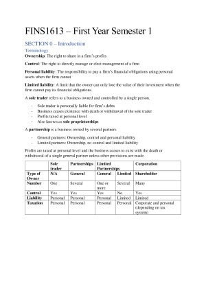 Summary Notes covering all of FINS1613 Course Material from Semester 1, 2018 Topics Included: 0 - Introduction 1 - Financial Mathematics 2 - Valuation of a Firm’s Securities 3 - Investment Decision Rules 4 - Capital Budgeting 5 - Cost of Capital