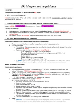 Competition and Consumer Law Exam Notes that will assist you as you study the course, as well as in the exam. I achieved a high 80/low 90s in the exam with these notes. Contained in the notes are sample 'exam script' sentences that will prompt you in studying exam style questions. Major cases studied in the course also have 'trigger sentences' which briefly summarise the case, and will assist you in analogising cases to the problem question. Topics covered within the notes: COMPETITION LAW - Markets, market power and competition - Anti-competitive Arrangements - Mergers and acquisitions - Misuse of market power - Resale price maintenance ACL - Goods with safety defects - Product safety - Unfair contract terms and unconscionable conduct - Misleading or deceptive conduct - Consumer Guarantees