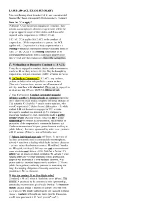 Comprehensive, detailed notes optimised for the final exam (HD), taken in the Winter Session, 2018. Topics: - Misleading and Deceptive Conduct - Unconscionable Conduct - Unfair Contract Terms - Unsolicited Consumer Agreements - Consumer Guarantees - Defective Goods Actions - Accessorial Liability *These notes are accurate to the best of my knowledge and sourced from workshops, lectures, readings, statute and the prescribed textbook. Information reflects the author's own understanding and all notes should be used to guide your own understanding and organisation of course material.