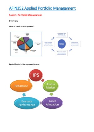 For the informative AFIN352 unit, these comprehensive study notes are based on Lecture notes, Tutorial exercises and Homework questions as well as a detailed summary of all relevant textbook material. With the right notes and preparation, you can perform well in AFIN352 unit across the assignments and exams throughout the semester. My notes cover all difficult questions that can be covered within the unit as well as providing accurate diagrams for Markowitz and Black Litterman Models and Bond Pricing. As a general overview, topics included are: Portfolio Management, The Minimum Variance Portfolio, Efficient Markets, Black Litterman Model, Passive and Active Portfolio Management, Portfolio Performance Measurement, Interest Rates and Bonds, Swaps and Hedging Stategies. Good Luck!