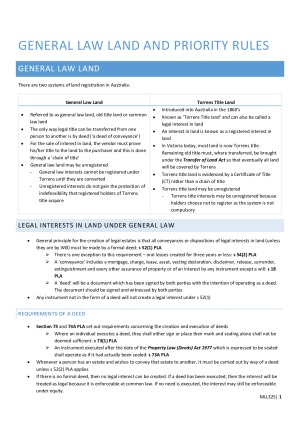 Clear and concise exam notes with easy to understand cases summaries that help in answering exam questions. Topics include: - General Law Land & Priority Rules - Electronic Conveyancing - The Torrens System & Indefeasibility - Statutory Exceptions to Indefeasibility - Non Statutory Exceptions to Indefeasibility - Volunteers - The Assurance Fund/State Guarantee of Title - Unregistered Interests - Co Ownership: Joint Tenancy and Tenancy in Common and Rights & Duties - Co Ownership: Severance & Partition