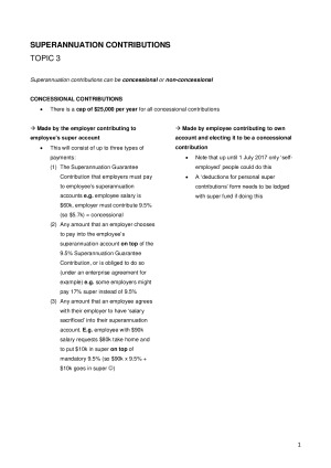 Succinct exam ready notes including relevant cases and legislation for easy reference in exam. Would make a great study tool during trimester to annotate and add examples. Topics include: - Superannuation Contributions - Complying Superannuation Funds - Taxation of Superannuation - Running a Superannuation Fund - Self-Managed Super Funds
