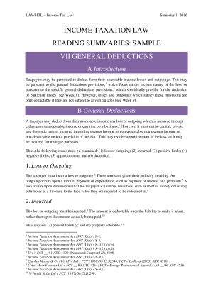 Summaries compiles information from lectures, tutorials, textbooks, commentary, legislation and case law. Textbook used were S Barkoczy, Foundations of Taxation Law (6th ed, 2014, Oxford University Press, South Melbourne) and P Burgess, et al, Income Taxation: Commentary & Materials (2012, Thomson Reuters, Sydney). Topics covered include: 1. Ordinary income - personal services, property, business; 2. Statutory income - CGT; 3. General deductions; 4. Specific deductions; 5. Taxation of entities; and 6. Tax avoidance and planning.