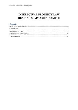 Summaries compiles information from lectures, tutorials, textbooks, commentary, legislation and case law. Textbook used was William Fishers, ‘Theories of Intellectual Property’ in Stephen Munzer (ed), New Essays in the Legal and Political Theory of Property, Cambridge University Press, 2001. Very thorough and includes sources of all information. Written for the purpose of problem-solving during exams. Topics covered include: 1. Introduction and theory; 2. Copyright law; 3. Confidentiality and privacy; and 4. Patent law.