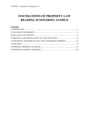 Summaries compiles information from lectures, tutorials, textbooks, commentary, legislation and case law. Textbook used was Robert Chambers, An Introduction to Property Law in Australia (Thomson Reuters, 3rd ed, 2013. Very thorough and includes sources of all information. Written for the purpose of problem-solving during exams. Topics covered include: 1. Concept of property; 2. Key land law concepts - estates and native title; 3. Original acquisition to title of land and goods - possession and adverse possession; 4. Intentional transfer of title to personal property - sale, gift, express trust and testamentary; 5. Bailment; and 6. Personal property securities.