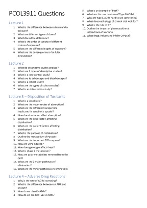 These are a set of exam style questions written by myself for PCOL3011 and PCOL3911. These questions are extremely high-yield and cover all areas of the course. Since the PCOL final is long answer, this style of revision will help you tremendously! I used these questions to prepare and received an overall mark of 85. I majored in Advanced Pharmacology and graduated with an HD WAM across all Senior Pharmacology units. I attribute these marks to the style of studying I used with these notes.