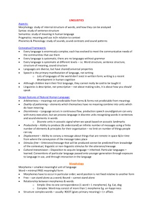 These notes use diagrams, tables, bullet points and colour coding to concisely summarise content covered while keeping the necessary detail to do well in the subject! Topics included: Morphology Syntax Semantics Pragmatics Language and variation Brain and language First language acquisition) Topics taught but not included in these notes: Phonetics & Phonology (mostly used phonetic alphabet table for these topic from memory)