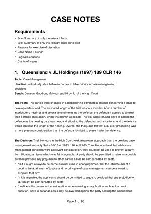 The Notes cover topics that were examinable under the final exam. They inlcude material from the lecture slide, seminar notes, textbooks and other high disctinction notes. They go through how to answer a question on any of the topic step by step. The notes are in paragrpah form so they can be answered as it is in a final exam. The notes provide case notes all 13 cases studied in the semester. The topics covered include: 1. INTRODUCTION; GUIDING PRINCIPLES; CASE MANAGEMENT and OVERRIDING PURPOSE 2. PRE-LITIGATION REQUIREMENTS and ALTERNATIVE DISPUTE RESOLUTION 3. ACCESS TO JUSTICE; OPEN JUSTICE; PRE-LITIGATION; CLIENT CARE 4. INITIATING PROCEEDINGS; COMMENCING LITIGATION; DRAFTING PLEADINGS 5. EVIDENCE IN PROCEEDINGS; DISCOVERY 6. INTERLOCUTORY APPLICATIONS; INJUNCTIONS 7. COST AS A MEANS OF MANAGING LITIGATION; COST ORDERS 8. STRIKE OUT; SUMMARY DISPOSAL; VEXATIOUS LITIGANTS 9. JUDGE ENFORCEMENT; APPEALS The Cases covered include 1. Queensland v JL Holdings (1997) 189 CLR 146 2. AON Risk Service v Australian National University (2009) 239 CLR 175 3. Bulldogs Rugby League Club Ltd v Williams [2008] NSWSC 822 4. Gunns Ltd v Marr [2005] VSC 251 5. Dow Jones & Co v Gutnick [2002] 210 CLR 575 6. Markisic v Department of Community Service of NSW (No 2) [2006] NSWCA 321 7. Silversides Superfunds P/L v Silverstate Developments P/L [2008] NSWSC 904 8. Vaughan v Dawson [2005] NSWSC 33 9. Legal Services Commissioner v Mullins [2006] QLPT 12 10. Firth v Latham & Ors [2007] NSWCA 40 11. Kain v Mobbs (No 2) [2008] NSWSC 599 12. General Steel Industries Inc v Commissioner for Railways (NSW) (1964) 112 CLR 125 13. Attorney General of NSW v Rahman [2014] NSWSC 42 LIGHTNING TALK – MEDIATION