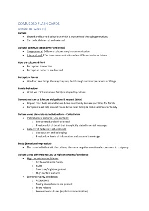 This document includes terms and definitions that you will need to know for the COMU1030 final quiz. I constructed it from the lectures and tutorials of weeks 10-12. It is structured so that you can print if off and use it as flashcards, or you can simply memorize the terms. I also suggest reading the textbook to further define these terms. Topics Covered: (Week 10) Tutorial 7. Professional Communication (Week 10) Lecture 8. Intercultural Communication (Week 11) Lecture 9. Health Communication (Week 12) Lecture 10. Communication with Social Media