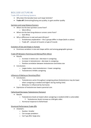 This document includes everything you need to know for the entirety of BIOL1100. It has all 11 lectures summarised in neat, cohesive notes that include all definitions, examples, graphs that are clearly explained and even helpful images. I became passionate about this course and it encouraged me to write extensive notes and achieve a high grade on the weekly quizzes (almost a 7). I guarantee this document will get you a great mark if you revise it, I hope you enjoy this course as much as I did! Topics Covered: 1. Early Hominin Evolution & Modern Human Psychology (Lecture 1) 2. Early Hominin Evolution & Modern Human Psychology (Lecture 2) 3. Natural Selection & Biological Variation 4. Sexual Conflict 5. Sexual Selection Theory & Humans 6. Trade-Offs and Mating Systems 7. Understanding the Mating System of Great Apes 8. Lying and Cheating in Nature 9. Energy Budgets and Food Intake 10. The Evolution of Human Food Choices 11. The Evolution of Life Span (and Back to Food)