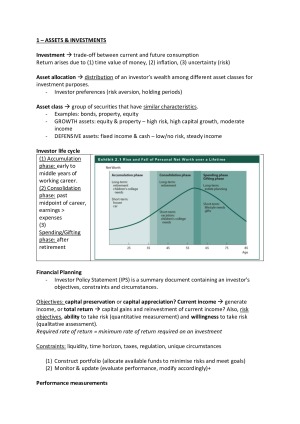 A complete and concise summary of the syllabus for finals. Organized for quick reading and also good for comprehensive memorizing. All formulas, theory explanations plus appropriate graphics and charts included for further understanding. Chapters from study weeks summarized and covered comprehensively: WEEK 1 - ASSETS & INVESTMENTS WEEK 2 - PORTFOLIO THEORY WEEK 3 - ASSET PRICING MODELS WEEK 4 - MARKET EFFICIENCY WEEK 5 - BEHAVIOURAL FINANCE WEEK 6 - CFAI CODE OF ETHICS & STANDARDS OF PROFESSIONAL CONDUCT WEEK 7 - BONDS WEEK 8 - SECURITY ANALYSIS I WEEK 9 - SECURITY ANALYSIS II WEEK 11 - PORTFOLIO MANAGEMENT II